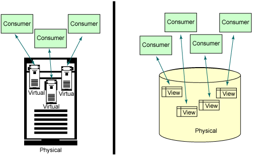 这种模式是虚拟化最广泛使用的模式之一。它只包含一个物理资源,但是它向消费者呈现的逻辑表示却仿佛它包含多个资源一样。消费者与这个虚拟资源进行交互时就仿佛自己是惟一的消费者一样,而不会考虑他正在与其他消费者一起共享资源。虚拟机就是这种模式的一个例子。硬件物理分区和逻辑分区(如IBM System p、System z和System i服务器)或软件产品(如 VMware、Microsoft Virtual Server和Xen)都实现了服务器的虚拟化。数据库视图的使用将数据与消费者隔离开来,这样可以基于消费者的角色和身份验证对资源进行访问,即使在所有消费者同时访问相同的数据库时,也不会出现任何问题。另外,网格使用虚拟化技术来管理网络上的数据,并在逻辑上将其作为一个系统呈现给消费者。下面的两个图示说明了服务器和信息的虚拟化。