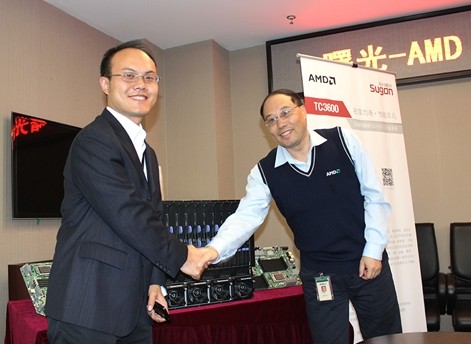 【曙光公司产品中心总经理刘朝辉(左)与AMD公司市场高级经理梁宏伟(右)】